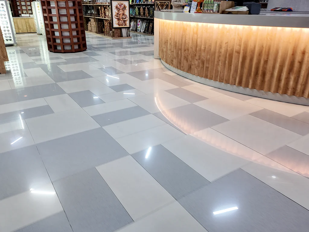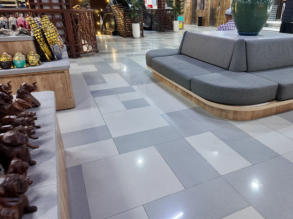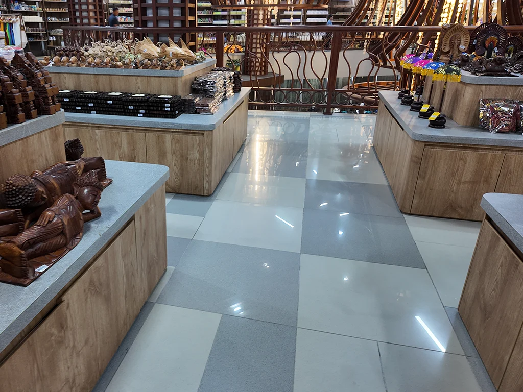 The combination of Greystone’s modern neutral tone and Honey’s warm character creates a welcoming shopping atmosphere while ensuring long-term performance. Designed for commercial spaces, these tiles offer strength, easy maintenance, and consistent visual quality, supporting Krisna Bali’s commitment to providing a comfortable and well-organized shopping experience that reflects both functionality and style.